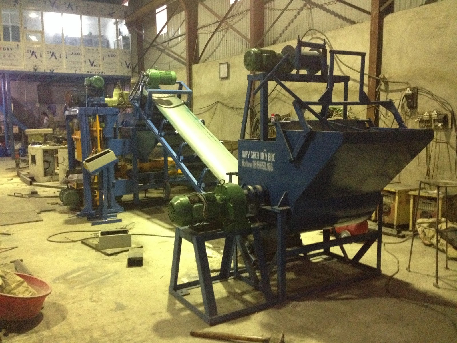 Máy trộn nguyên liệu: Cùng với các cốt liệu (mạt đá), nước và xi măng được đưa vào máy trộn một cách hoàn toàn tự động theo quy định cấp phối. Sau đó nguyên liệu được trộn ngấu đều theo thời gian cài đặt. Hỗn hợp sau phối trộn được tự động đưa vào ngăn phân chia nguyên liệu ở khu vực máy tạo hình (hay máy ép tạo block 4) nhờ hệ thống băng tải.